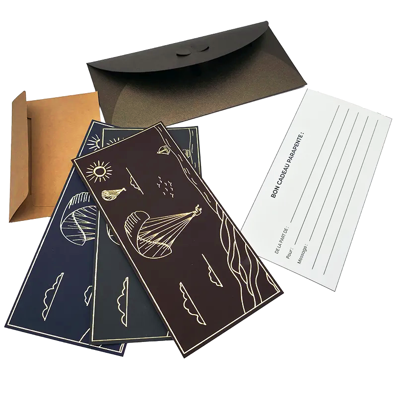 Une carte prestige personnalisable avec dessin doré, une notice explicative et une enveloppe pour glisser un mot personnel, le tout présenté dans une enveloppe haut de gamme.