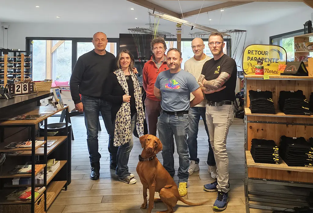 Hervé, Mikaëlle, Cyril, Philippe, Samuel, Maxime, Evelyse, Jonatan, Emma, et Adrien se plient en quatre pour que vos baptêmes de l’air et vos stages de parapente restent inoubliables en restant fidèles à la philosophie de l’école : beaucoup d’attention sur la qualité de formation, beaucoup de bonne humeur dans la transmission.