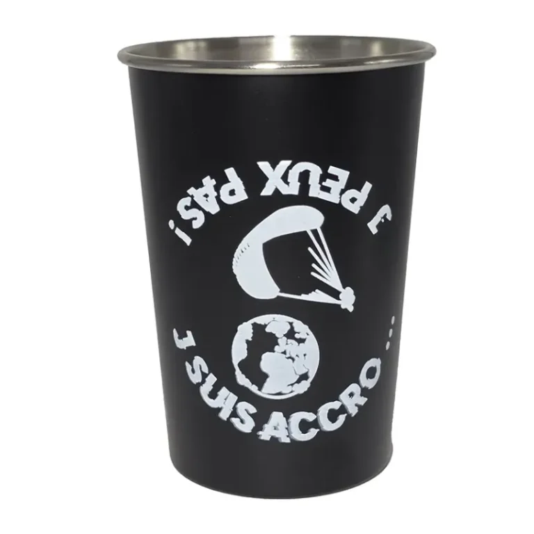 Une alternative responsable aux gobelets jetables et plastiques. Léger, solide et élégant, il vous accompagne partout avec son marquage « J’peux pas, j’suis acro ». Clin d’œil à l’univers du parapente.